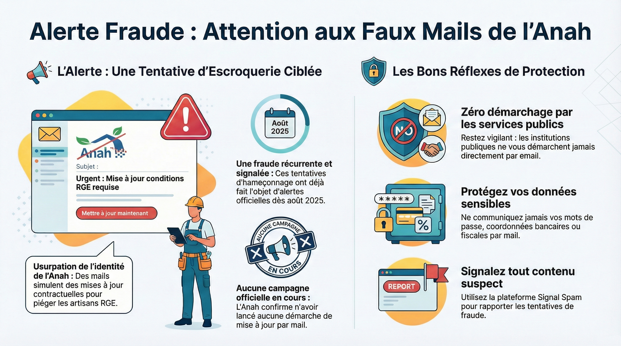 Des mails frauduleux adressés aux professionnels RGE circulent actuellement, laissant croire qu’ils émanent de l’Anah.