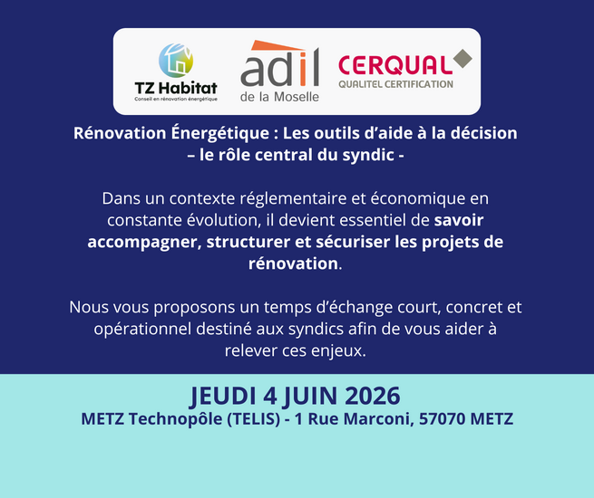 TZ Habitat, l’ADIL de la Moselle et CERQUAL Qualitel Certification proposent un temps d'échange avec les syndics autour de la rénovation énergétique